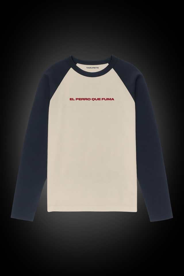 Camiseta blanca y azul de manga larga inspirada en el nuevo álbum de Taburete "El perro que fuma".
